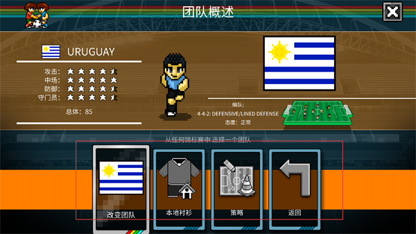 3、查看乌拉圭队的团队概述,了解其攻击防守等属性,点击改变团队可更换其他球队继续体验。