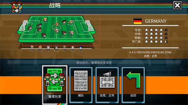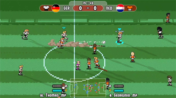 2、经典像素美术还原90年代主机足球游戏神韵,球员跑动时产生动态残影特效。不同国家代表队拥有专属配色与队服纹理。