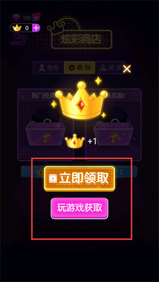 3、在商店的曲包分类,点击立即领取按钮获取奖励,或选择玩游戏获取来解锁对应道具。
