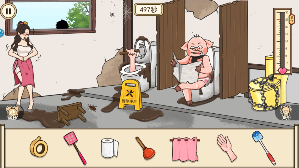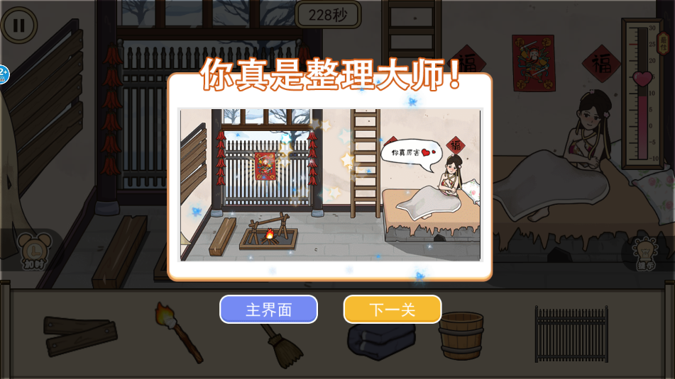 3、在500秒时间内,利用下方的6种物品,完成各项任务,使小姐姐的温度提升。