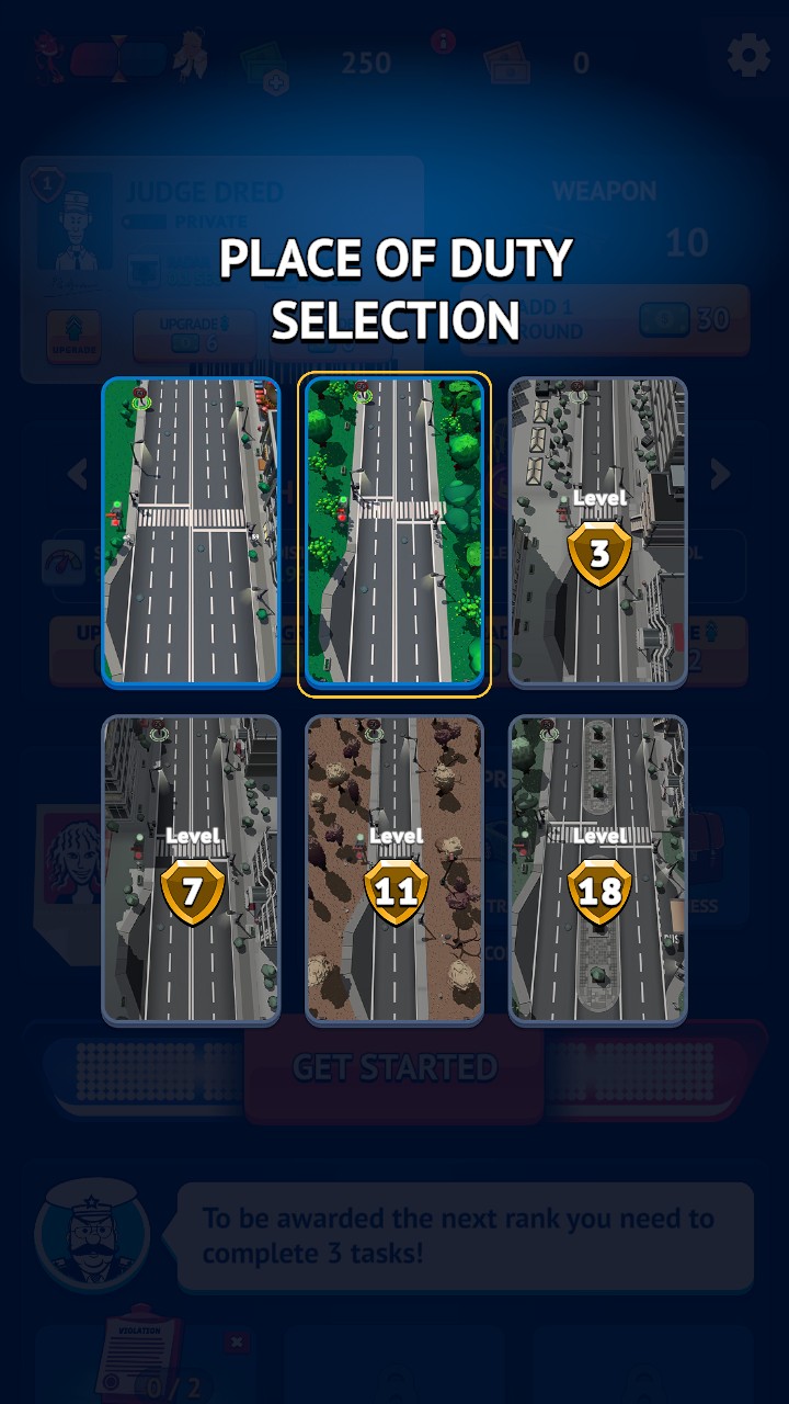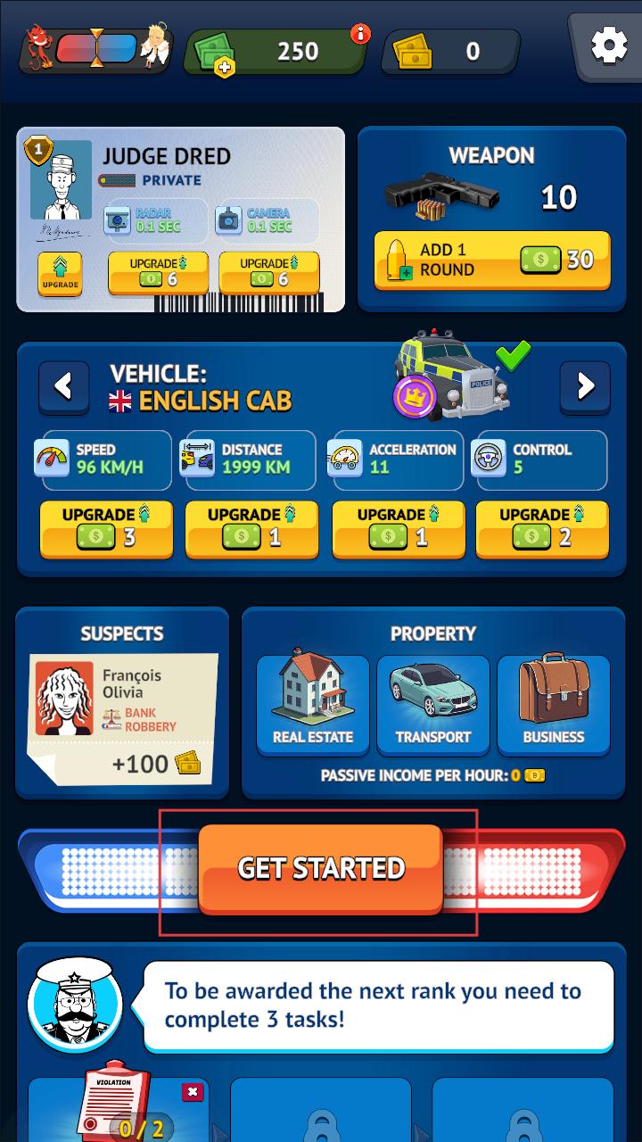 1、进入游戏界面,能看到角色、武器、车辆等可升级选项,还有嫌疑人与房产等信息,点击GET STARTED按钮,开启交警执法模拟。