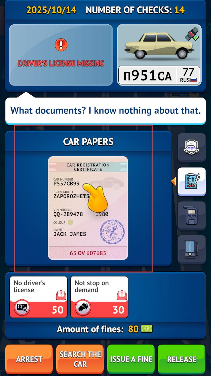 3、遇到车辆时,查看车辆相关文件,比如CAR PAPERS里的信息,检查是否存在驾照缺失等违规情况,根据情况选择处罚或释放等操作。