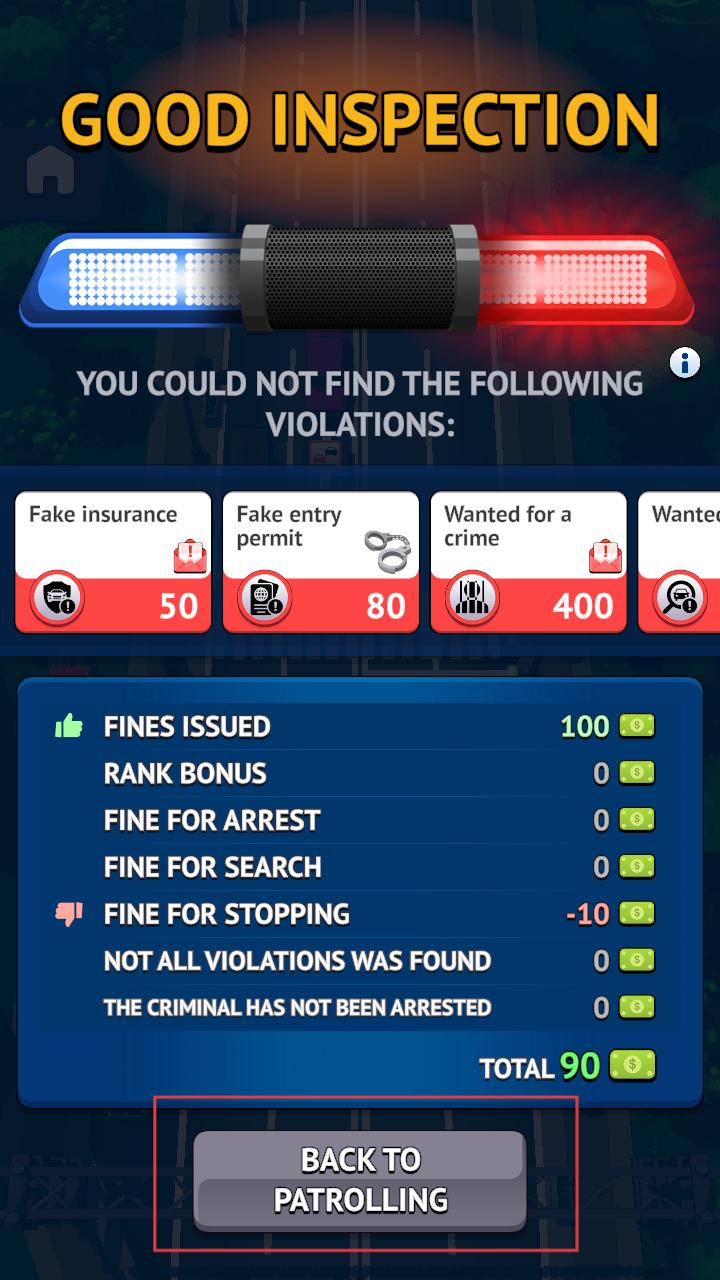 4、完成一次执法检查后,会出现包含罚款、奖励等结算信息的界面,查看本次执法成果,点击BACK TO PATROLLING按钮,继续巡逻执法。
