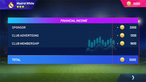 1、查看FINANCIAL INCOME界面的各项收入数据,了解俱乐部的资金来源,掌握当前可用资金情况。