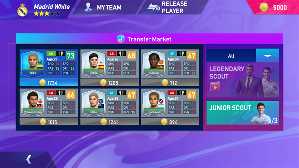 3、进入Transfer Market查看球员列表,了解不同球员的属性与所需资金,为球队引援做准备。