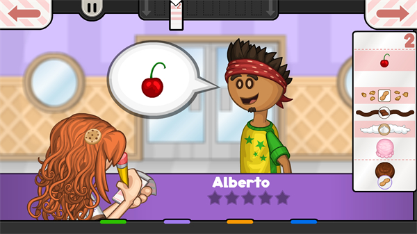 1、查看顾客Alberto的需求标识,确认其想要的樱桃配料,准备按照该需求开始制作对应的甜品。