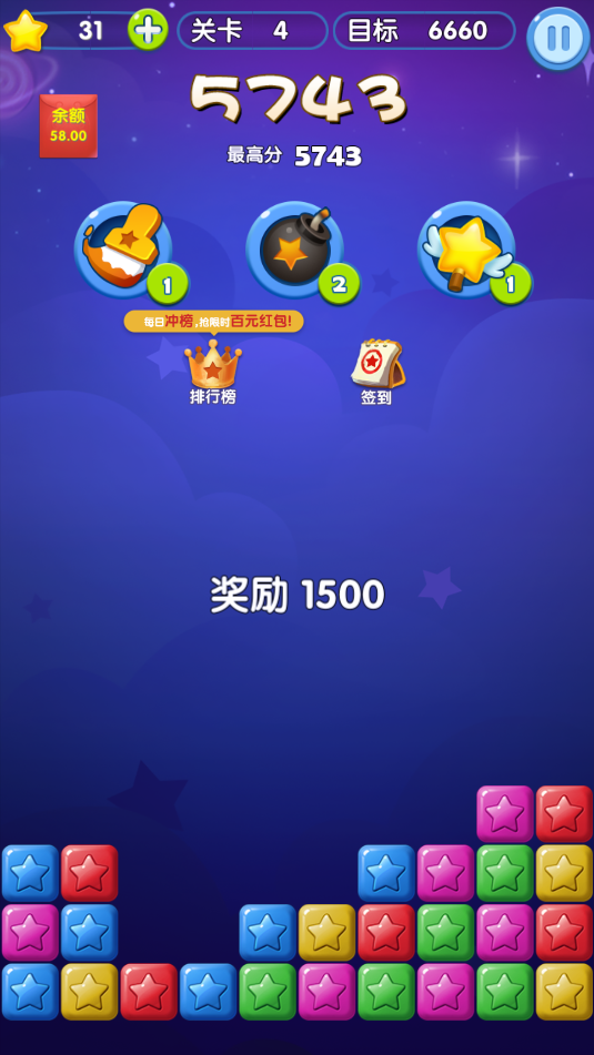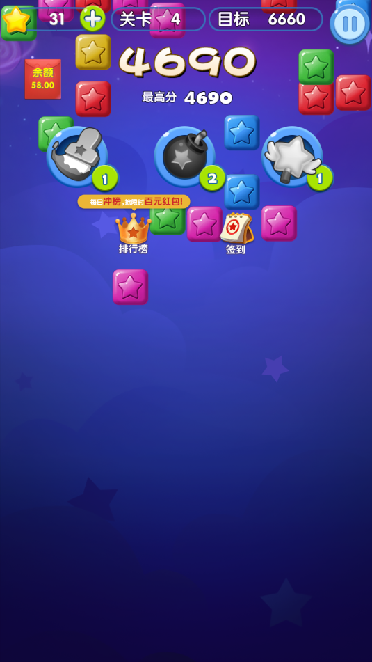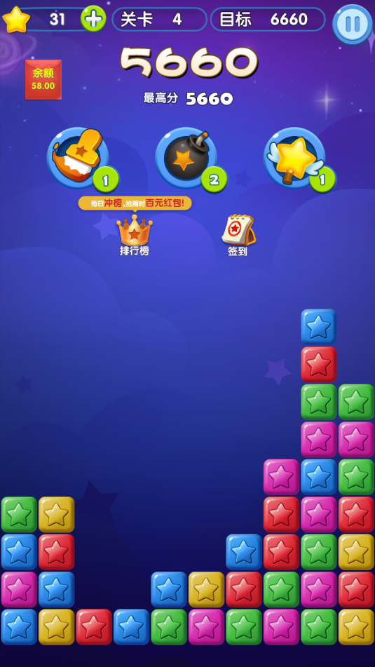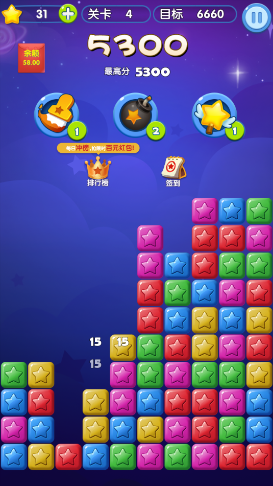 2、关卡中,需点击两个或以上的同色星星来消除获得分数。