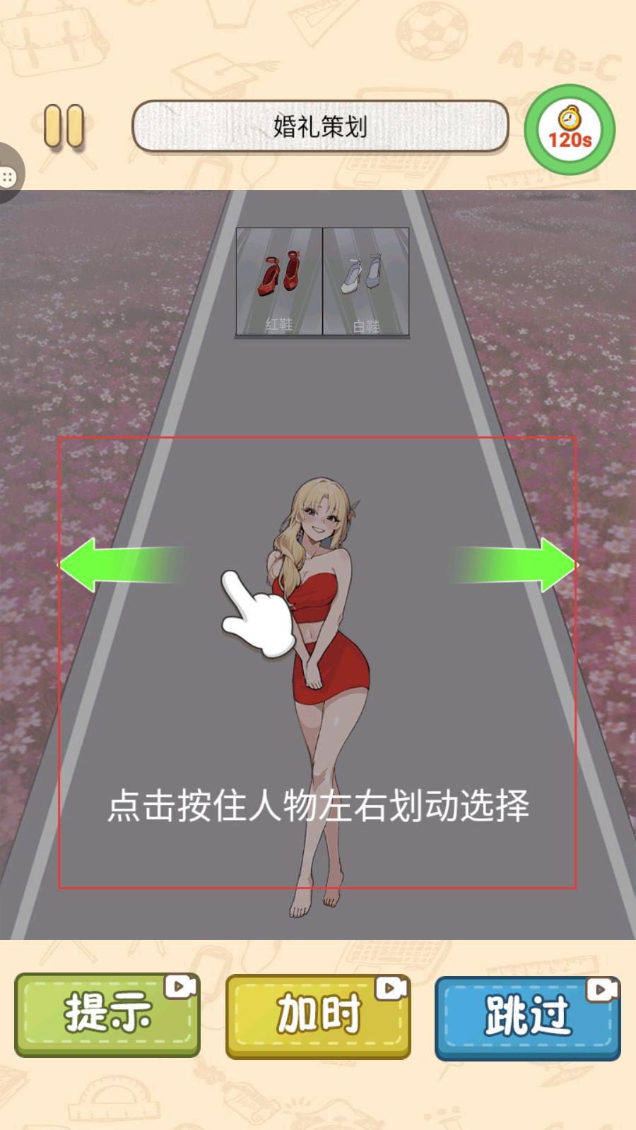 2、按照提示,点击按住人物左右滑动,可在红鞋、白鞋等选项中选择,进行鞋子的搭配尝试。