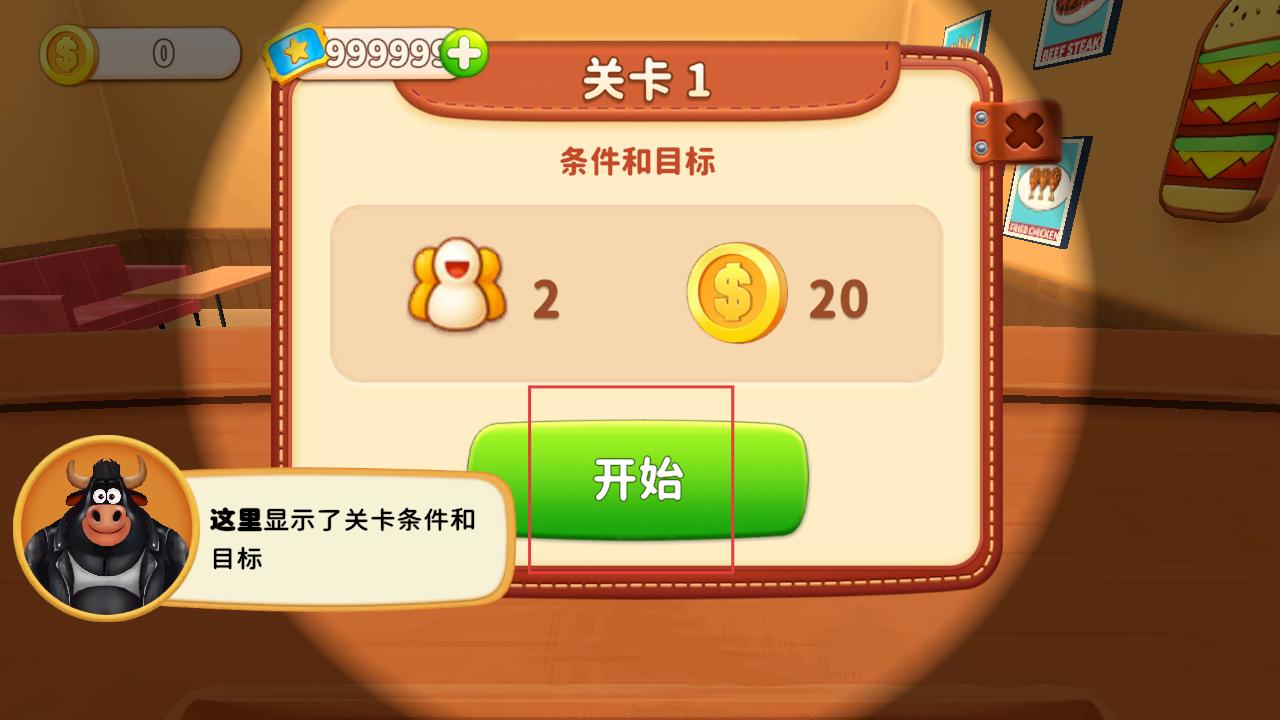1、进入关卡1界面,查看需完成的条件和目标后点击开始按钮,开启美食制作挑战,准备通过制作美食获取金币。