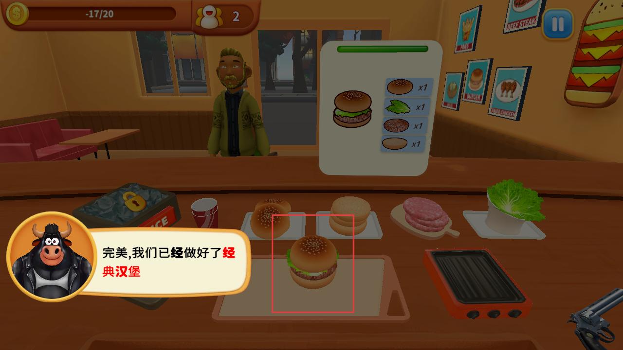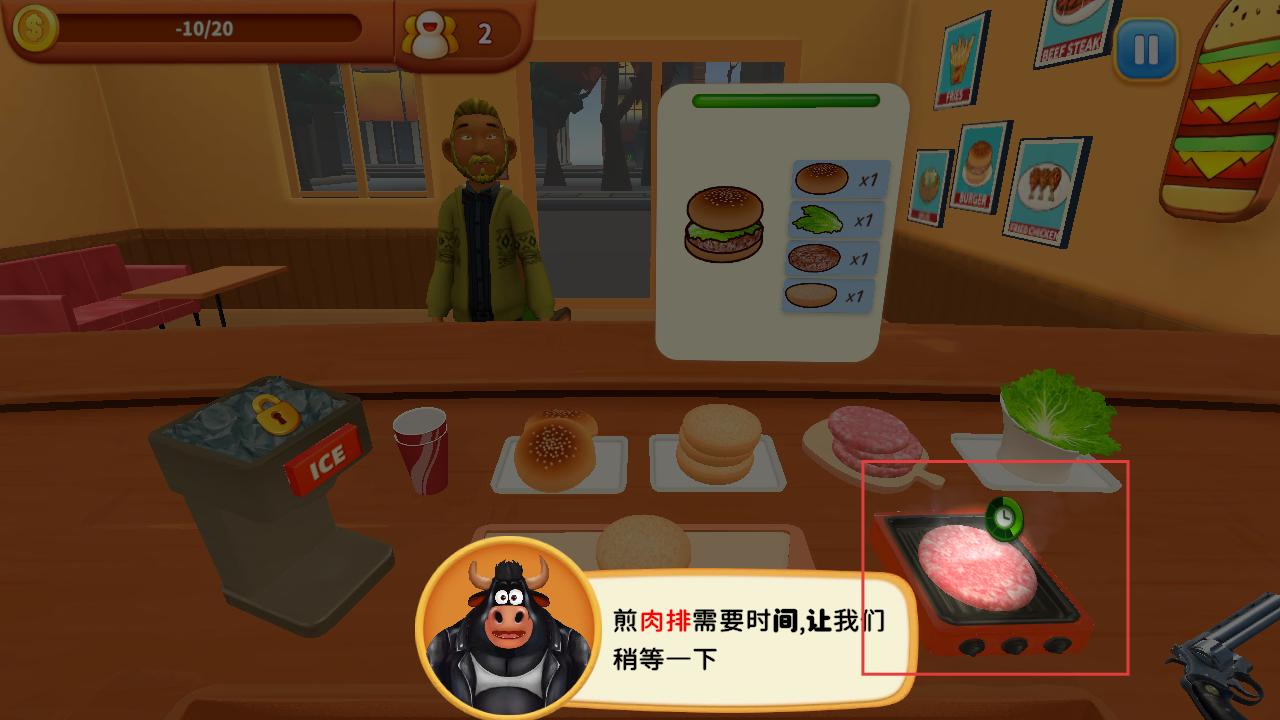 1、根据悬浮气泡提示准备订单食材,通过滑动切菜、点击煎烤等手势操作完成烹饪步骤,计时器系统考验多线程处理能力。
