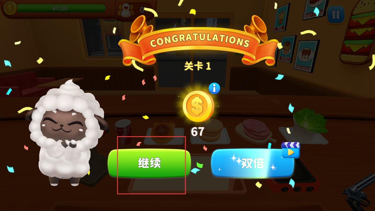 4、关卡1完成后出现祝贺界面,点击继续按钮,可进入下一个关卡,继续经营餐厅制作美食,挑战更多关卡。