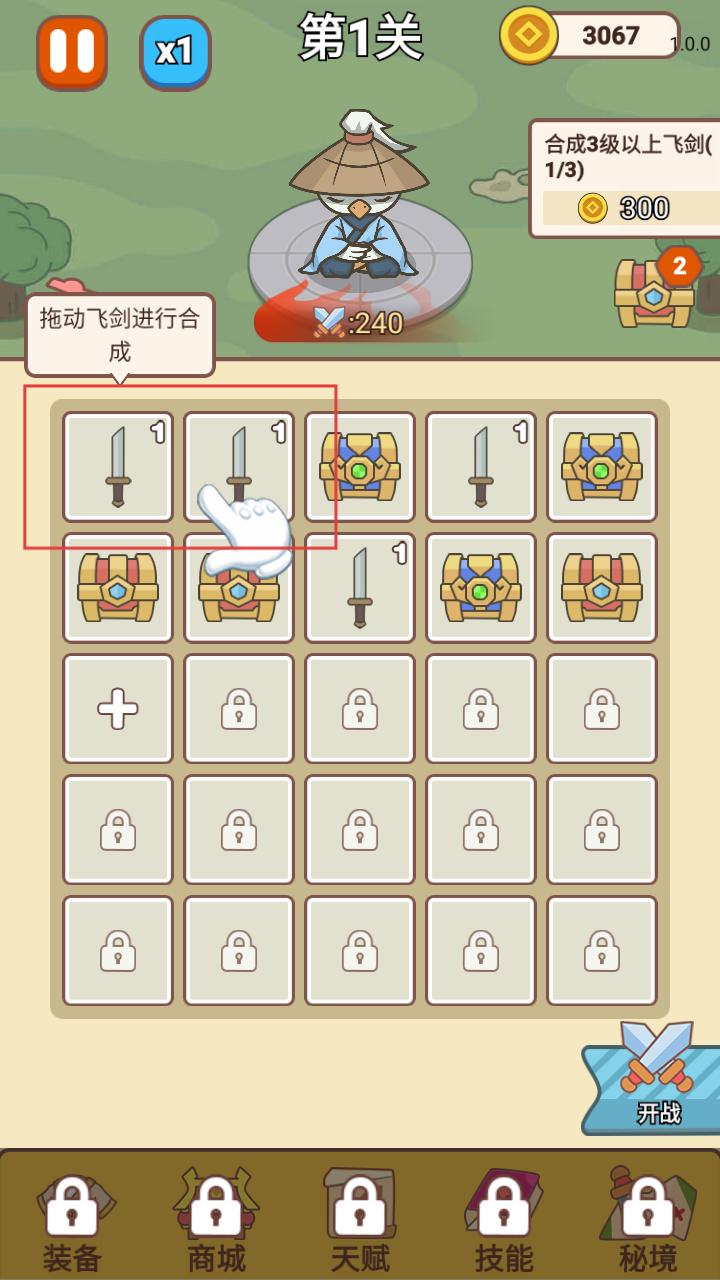 1、通过拖放操作在棋盘部署飞剑,相同等级可三合一进阶。高阶飞剑具备范围伤害和特殊效果,合理搭配构成防御阵列。