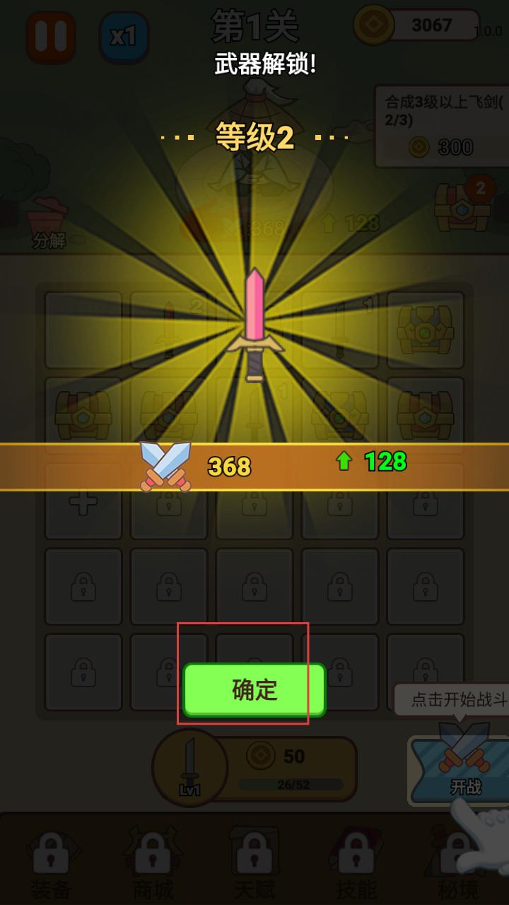 2、合成后解锁更高等级武器,点击确定按钮确认,提升飞剑战力,为后续战斗做好准备,不断解锁更强武器助力冒险进程。