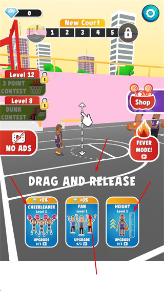 1、拖动角色瞄准篮筐释放投篮,优先升级啦啦队、粉丝、身高,提升投篮优势。