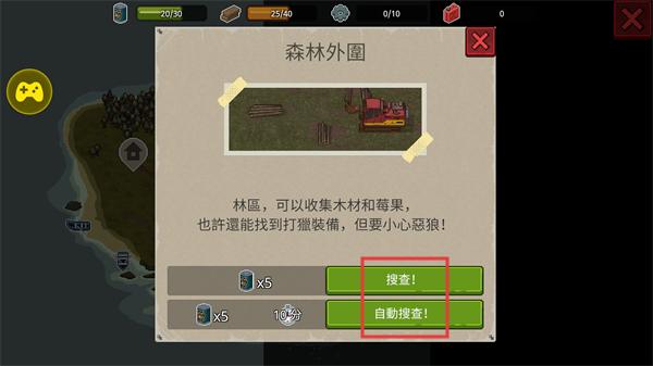 4、在森林外围等区域点击搜索,收集木材、莓果等资源,同时留意潜在危险,为基地建设和生存积累物资。
