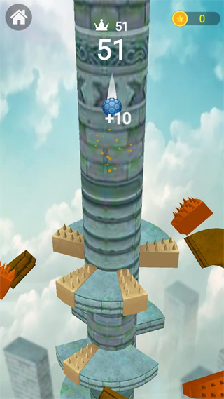 2、核心操作为滑动屏幕,控制小球左右移动,避开红色尖刺等致命障碍,触碰蓝色星星可累积分数,遇到弹簧会自动反弹改变下落方向。