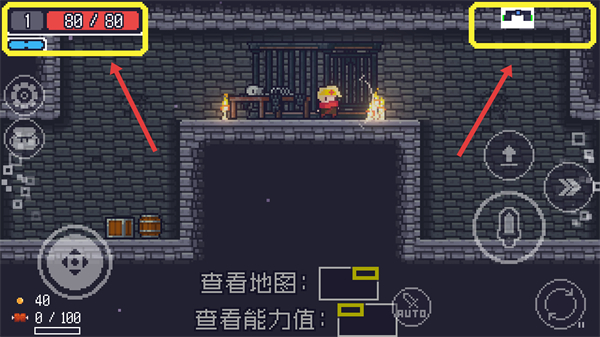 2、点击对应按钮查看地图与能力值,了解当前区域布局和自身状态,辅助在地牢场景中的探索行动。