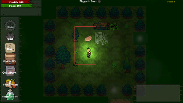 3、操控角色在森林场景中移动,查看周围环境,同时关注界面显示的生命值与食物数值变化。