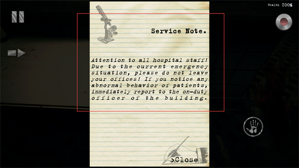 1、查看这份Service Note了解医院紧急通知,获取关于人员行动的提示信息,之后点击Close关闭笔记,继续推进解谜探索。