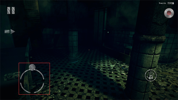 2、操控左侧的移动摇杆控制角色在走廊中行进,在昏暗的精神病院场景里探索新区域,寻找推进解谜的线索。