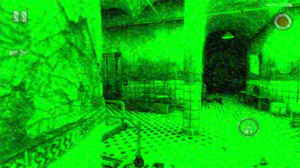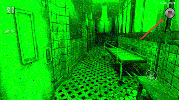 4、操控视角调整按钮转动画面,观察当前绿色滤镜下的走廊场景,寻找隐藏的互动点或可探索的区域。