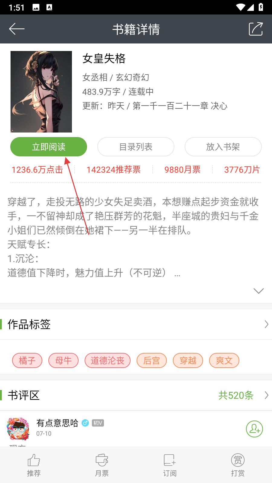 3、在书籍详情页面,可查看小说字数、更新情况等信息,点击立即阅读,进入小说阅读页面,开始阅读。