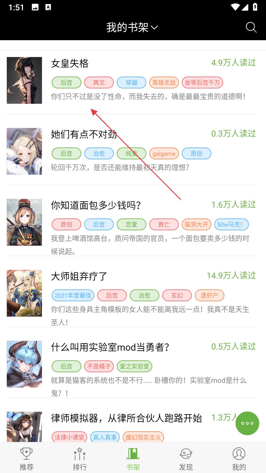 2、进入我的书架页面,能看到女皇失格、她们有点不对劲等小说,点击感兴趣的小说,进入书籍详情页面。