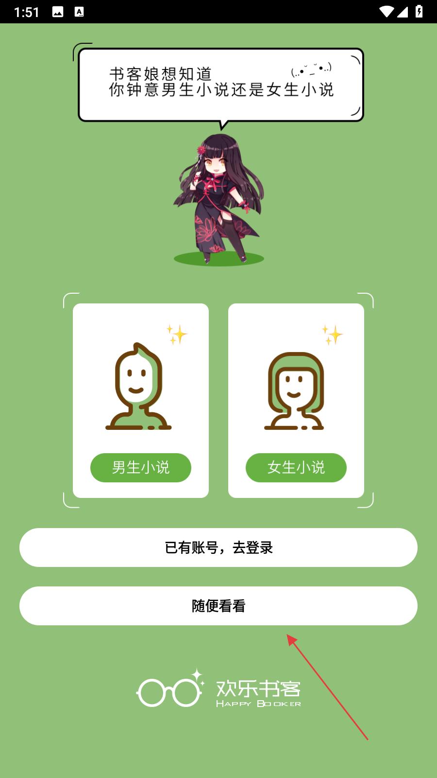 1、打开欢乐书客,进入初始页面,可选择男生小说、女生小说,也能点击随便看看,进入APP主界面。