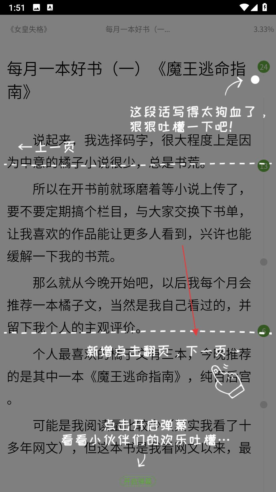 4、进入小说阅读页面,可看到小说内容,还能点击开启弹幕,查看小伙伴们的吐槽,也可点击翻页,继续阅读后续内容。