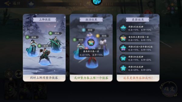 1、策略深度拉满:金木水火属性相克+侠客羁绊激活,4水1阴等组合可定制战斗风格。