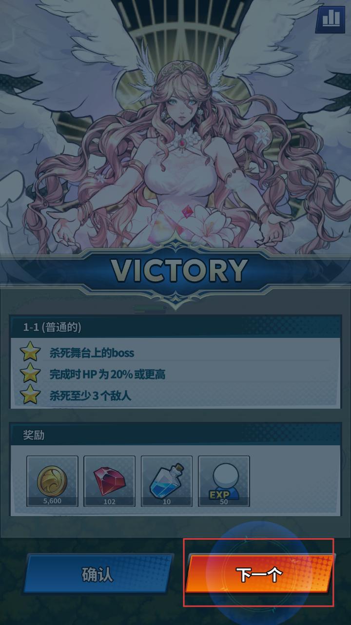 4、战斗胜利后,会展示胜利界面,可点击下一个按钮,继续后续的冒险与战斗。