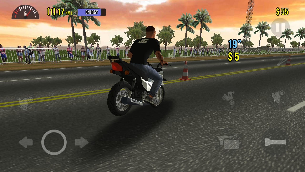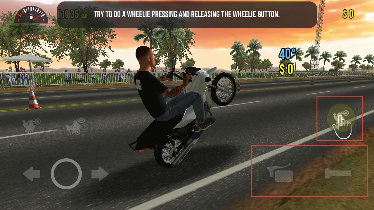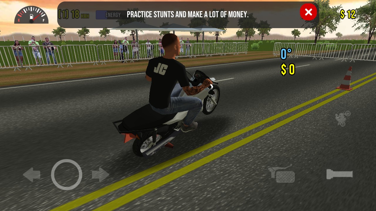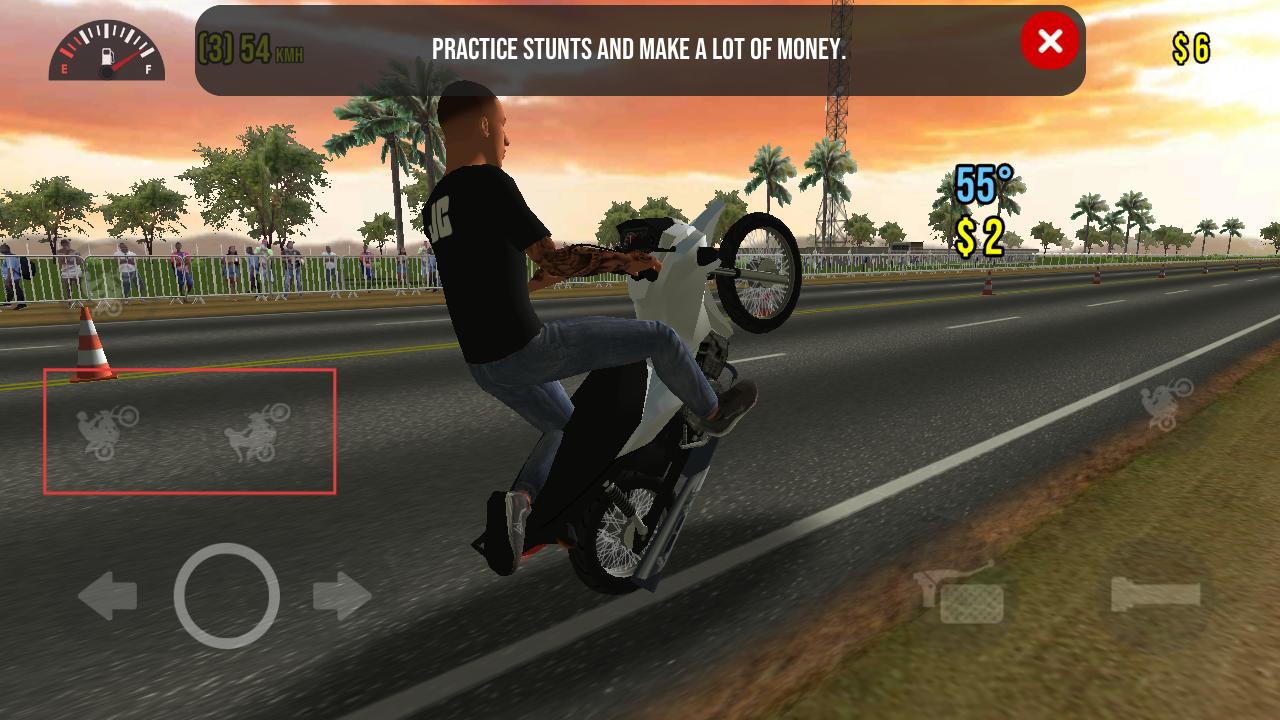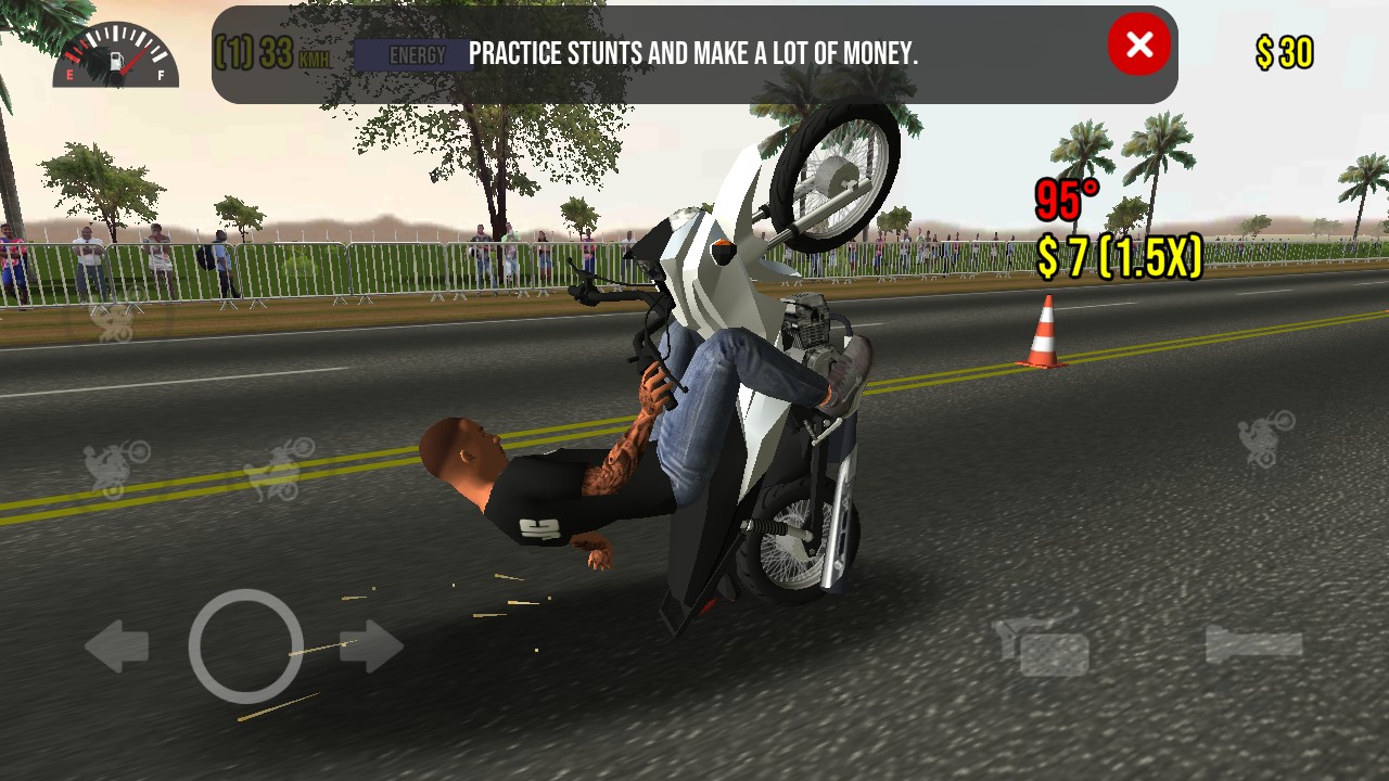 2、在驾驶过程中点击右侧wheelie按钮,让摩托车前轮离地,同时关注角度和速度,完成特技动作以获取分数。