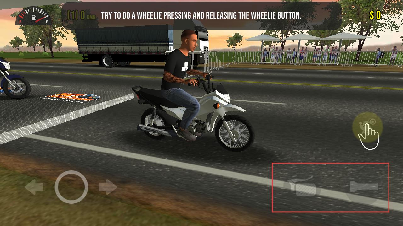 1、进入游戏看到摩托车驾驶场景,根据提示尝试按下并释放wheelie按钮,学习做前轮离地特技,开启摩托特技挑战。