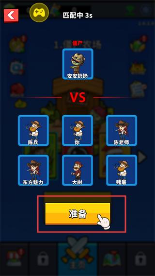 1、匹配对战时点击准备,开启与其他玩家及安安奶奶等僵尸的对决,在农场防御战中展开策略对抗。