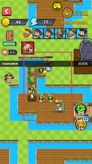 2、在农场中布置植物、升级牧场,持续生产资源,抵御僵尸入侵,努力坚持到种子发芽结束,赢得战斗。