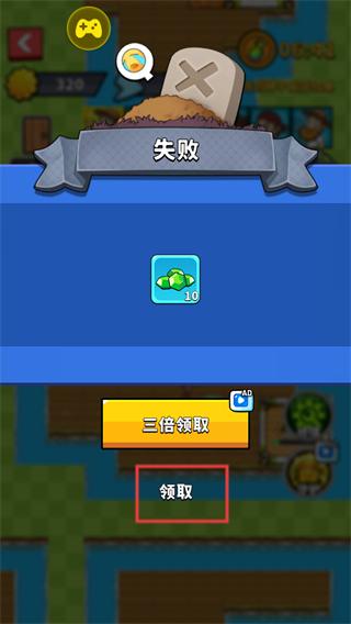 3、若战斗失败,会出现失败界面,点击领取奖励,之后可再次挑战,继续尝试在农场中抵御僵尸。