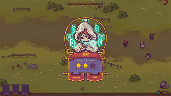 4、战斗结束后查看结算界面,获取对应星级评价,选择继续按钮开启下一轮的防守挑战。