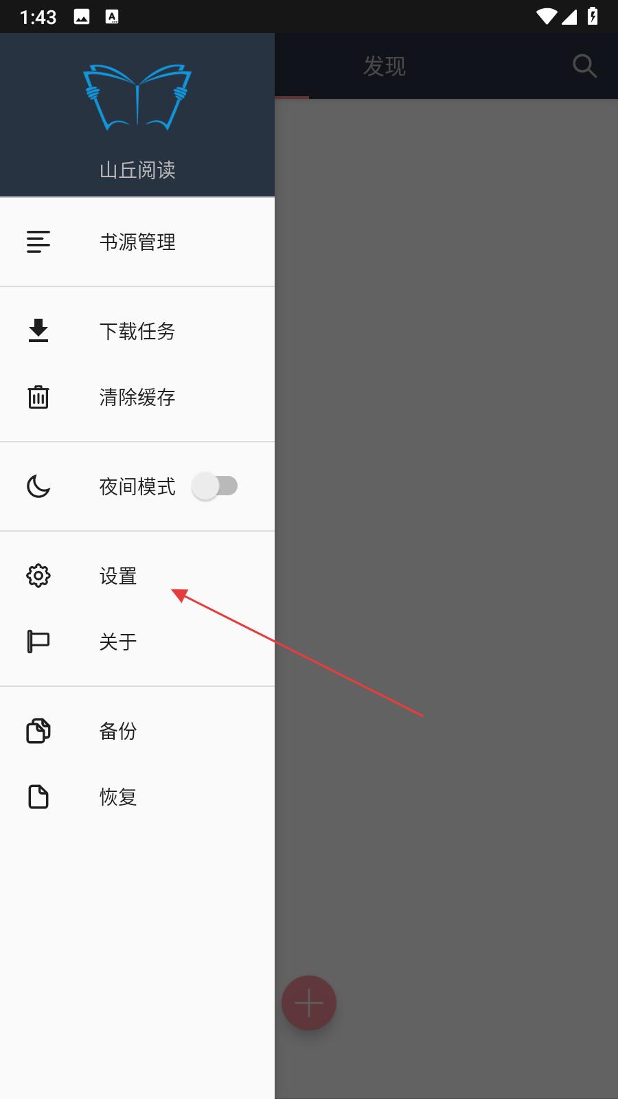 2、在展开的侧边栏中有书源管理、下载任务等选项,点击设置,进入设置页面,可对APP进行相关设置。