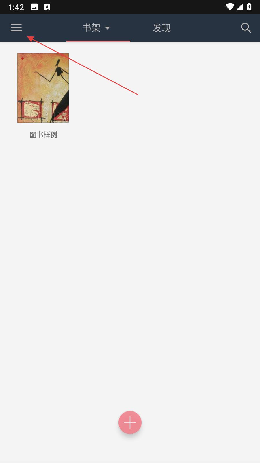 1、打开山丘阅读器,进入书架页面,能看到图书样例,点击左上角三条横线图标,展开侧边栏,可查看更多功能选项。