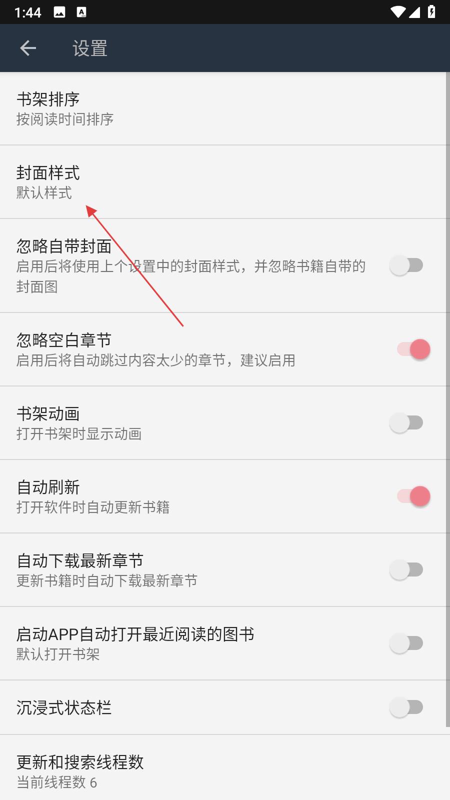 3、进入设置页面,能看到书架排序、封面样式等设置项,可根据需求调整,比如更改封面样式,让书架展示更符合喜好。