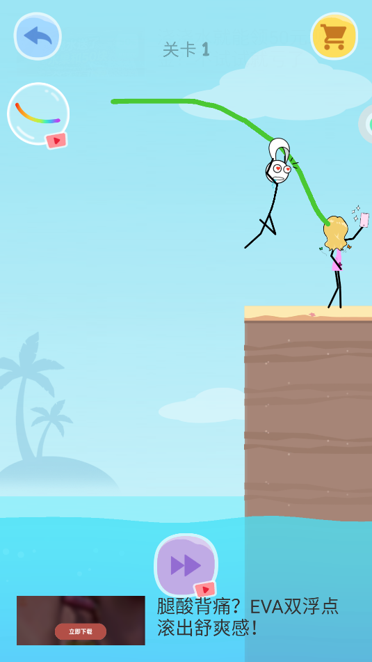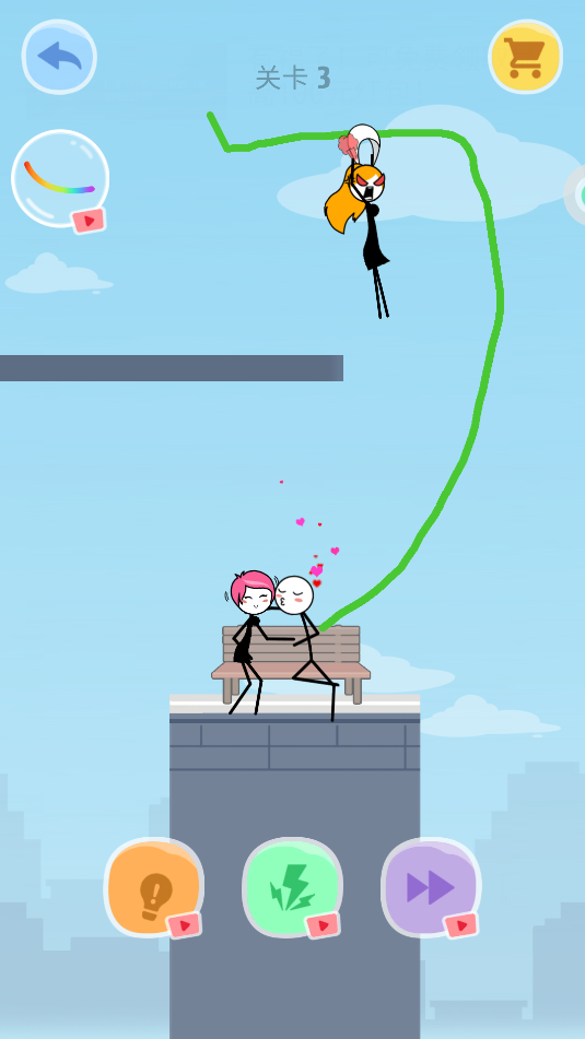 2、游戏里,需画出一条线,让火柴人可以顺着画线滑向女友。