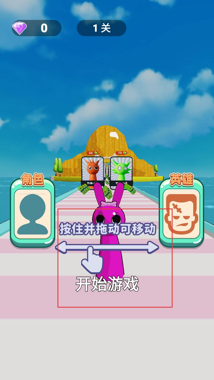 1、进入游戏界面,看到关卡信息和角色提示,按住并拖动角色,再点击开始游戏,开启跑酷冒险。