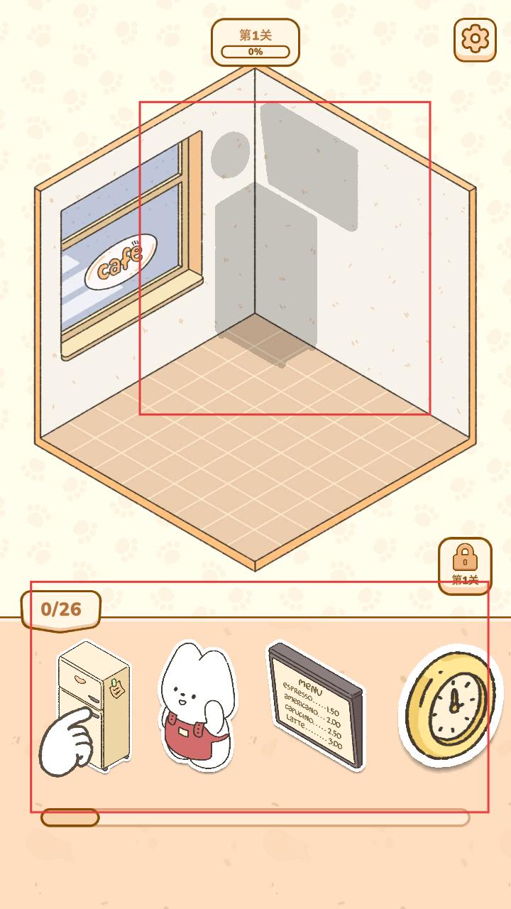 2、在装修界面,下方有冰箱、小动物、菜单板等贴纸,可将它们拖到上方的房间里,进行布置。