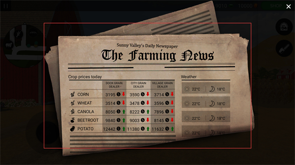 1、查看报纸界面中的作物价格与天气信息,了解当前市场行情和环境变化,为后续的农场经营决策做参考。