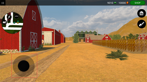 2、操控界面中的移动按键,控制角色在农场场景内移动,熟悉barn与农田等区域的布局,准备开展农作活动。
