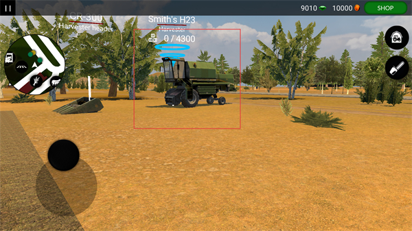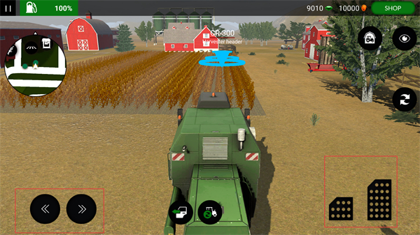 4、操作收割机的移动与功能按键,控制农机进入农田区域,开启作物收割的操作,推进农场的生产流程。
