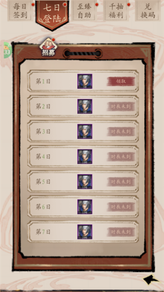 2、进入“招募”系统使用免费招募令,优先收集有羁绊关联的武将,提升阵容战力。