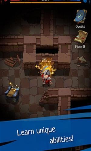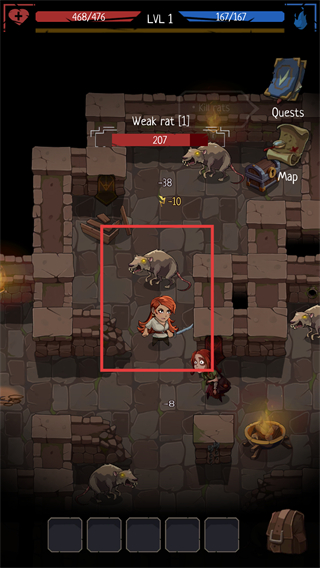 2、在随机生成的像素地牢中探索,遭遇Weak rat等怪物,战斗可获得经验、金币等资源,还能发现地图、宝箱等道具。