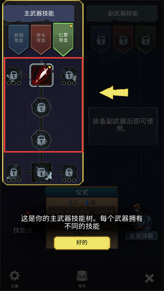 3、有主武器技能树系统,涵盖长剑、斧头、匕首等攻击类型,不同武器对应独特技能,消耗资源解锁技能节点,打造专属战斗风格。