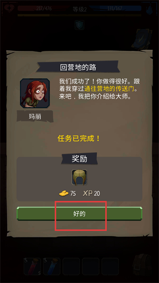 4、参与回营地的路等任务,完成后获得装备、金币、经验等奖励,点击好的继续探索地牢或返回营地。